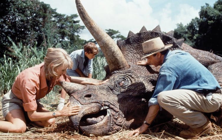 Shortly after seeing their first dinosaur, on-screen palaeontologist Alan Grant (Sam Neill) suggests to his palaeobotanist partner Ellie Sattler (Laura Dern) that the de-extinction success of Jurassic Park might make their profession redundant. Their colleague Ian Malcolm (Jeff Goldblum) responds, “Don’t you mean extinct?”